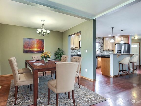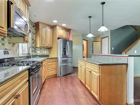 Welcome Home! Discover this beautiful 4 bedroom, 2.5 bath residence, complete with an office and spacious loft. As you enter, you'll be greeted by hardwood flooring throughout main floor, leading to the spacious living room with fireplace. The open kitchen boasts granite countertops and stainless steel appliances, with kitchen island and formal dining room. Upstairs, enjoy the additional living space with French doors leading to the primary suite, which includes 5-piece bath and walk-in closet. Three more bedrooms and a convenient utility room are also located on this level. Situated on a large corner lot with 3-car garage. You'll be just moments away from parks, a golf course, public transportation, shopping, schools, and JBLM.