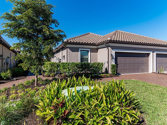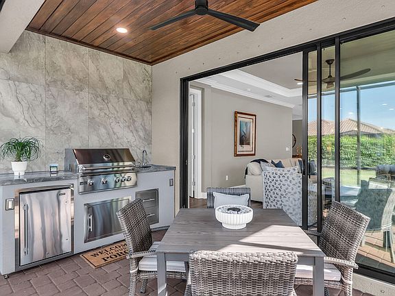 PRISTINE & BEAUTIFULLY FURNISHED, 3-bedroom plus office villa, where luxury meets comfort in every detail. LOCATED in the heart of the community. This beautifully appointed home boasts custom finishes throughout, including recessed LED lighting, crown molding, and exquisite decorative trim work. The open concept design flows seamlessly from room to room, with tile floors throughout and plantation shutters that add elegance and privacy. The heart of the home is the stunning outdoor kitchen, complete with a wood ceiling and a beautifully tiled wall, perfect for entertaining. The extended screened lanai invites you to relax and enjoy the Florida weather, while the newly landscaped front lawn and solar outdoor lighting enhance the home's curb appeal. Inside, you'll find spacious, custom closets, upgraded lighting and fans, and a finished garage with a sealed floor. The air-conditioned garage features custom cabinets, and the laundry room includes beautiful cabinetry for added storage. For added peace of mind, this home comes with a whole-house Generac generator and hurricane screen shutters. Tech-savvy features include a Ring front doorbell camera, five mounted TVs, and under-counter LED lighting in the kitchen and bathrooms. The built-in safe provides a secure space for valuables, while the dimmer switches throughout the home offer customizable lighting for any mood.This villa is not only beautifully furnished but also thoughtfully designed for convenience and security, with automatic outside security lights on a timer, and it is located outside of a flood zone. Lastly, elevate your everyday living at the luxurious clubhouse, where every amenity is designed for relaxation and recreation. Unwind at the full-service spa, stay active in the state-of-the-art fitness center, or sip your favorite cocktail at the tiki bar while soaking in the breathtaking views. For those who enjoy an active lifestyle, indulge in the infinity pool or take your game to the next level with pickleball, bocce ball, and tennis courts right at your doorstep. This stunning villa, paired with world-class amenities, is the ultimate in upscale living.