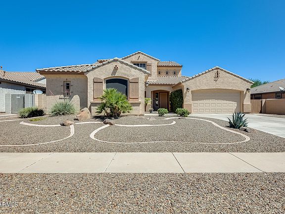 Step into elegance and style with this grand 2-story home that exudes luxury from the moment you arrive! Soaring ceilings greet you at the entrance, complemented by a stunning wrought iron stairwell that makes a dramatic statement. The expansive 3,115 sqft floorplan offers 4 bedrooms and 3 baths, with large neutral tile perfectly placed throughout. The kitchen is a dream—featuring an abundance of cabinetry, granite countertops, and a center island. Step outside to your private oasis with a covered patio, oversized backyard, brick paver walkways, and a resort-style fenced PebbleTec lagoon pool with mesmerizing sheer descent water features. The laundry room features a utility sink and cabinets for extra storage. With a 3-car split garage and grand curb appeal, this a your perfect sanctuary!