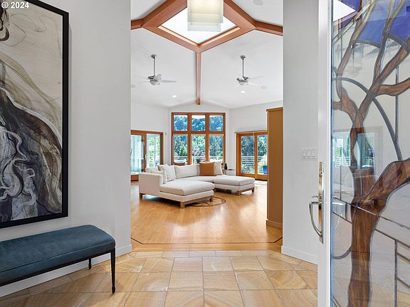 Scandanavian design meets southern California style in this engineer built custom 1-level home! Completely ADA accessible. Panoramic views of Pete's Mountain, trees, and the relaxing sound of the Tualatin River. Circular paver walkway and custom stained glass front door leads to onyx tile foyer. Vaulted living room with wall of windows and skylight for amazing natural light. Custom inlaid hardwoods throughout entire home. Custom kitchen w/granite counters, induction cooking, island with eating bar, built-in Thermador refrigerator. Bosch and Fagor appliances, central vac system. Primary suite with honed granite vanity, walk-in closet with custom organizers, and sliding glass door to back deck. Secondary suite with attached bathroom and jetted tub. Incredible tilework in each custom bathroom, built-ins with slide-out and soft-close drawers, solid core doors. Spacious garage with built-in cabinets and EV charger. Radiant heat with HEPA circulation system. Office as well as sunroom/workout room. Hunter Douglas blinds throughout. Incredible yard with full-length deck to home. Multiple sliding glass doors bring the outdoors in. Surround sound inside & out. Professionally landscaped yard with over 150 plants, all fully irrigated. Listen to the rushing rapids on this rare section of the Tualatin River while enjoying a completely private view of Pete's Mountain; yet just a short 2 blocks to food trucks, downtown Willamette restaurants, shopping, coffee and more! Lower level unfinished area perfect for more sq footage, ADU, or great storage! Great schools!
