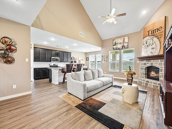 Step inside to a grand two-story entryway with soaring vaulted ceilings and an abundance of natural light. The open-concept living space features luxury vinyl flooring throughout the main level and a beautifully designed kitchen with a large granite island, custom cabinetry, and eat-in dining area ideal for both everyday living and entertaining. Thoughtful upgrades include custom closets, elegant architectural details, and generous storage.