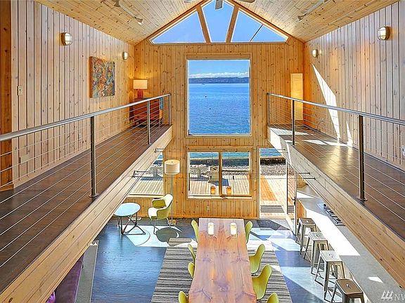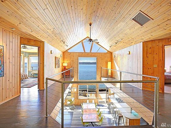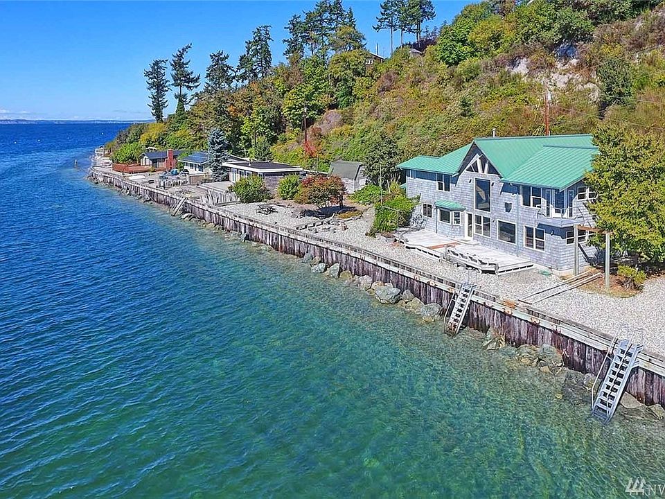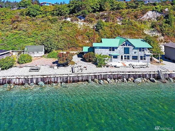 BEACH ACCESSIBLE West-facing Low-Bank Waterfront home on 145' +/- with tidelands. One of only five homes on this beach, it offers quietude seldom found in beach communities. This home enjoys sunsets, Olympic Mtn views, whales/marine life in Saratoga Passage. Contemporary wood interior, open 2-story great room with river rock fireplace, Master w/ fireplace & deck, extra finished rooms w/ closet, den, & loft. Large attached 1 car garage + parking. 2 Mooring buoys, floating platform, & beach.