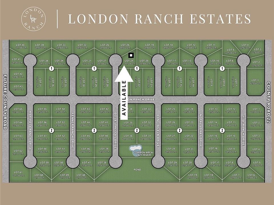Introducing London Ranch Estates, London’s newest gated community, where serene views of untouched farmland provide the perfect backdrop for your dream estate. Nestled in the heart of London, this brand new neighborhood offers expansive homesites of at least half an acre, creating a unique opportunity to design and build a custom home that fits your vision. Designed for privacy, tranquility, and elegance, London Ranch Estates features 108 spacious homesites, each thoughtfully planned to offer a balance of seclusion and community. Residents will enjoy premium amenities, including: a luxury ranch-style gated entrance for enhanced security and sophistication, a resort-style community pool and lazy river for ultimate relaxation, a scenic pond perfect for outdoor enjoyment. With no restrictions on builders or timelines, you have the flexibility to select your preferred builder and architect and start construction when you’re ready. Ideally located just minutes from the highway, this prime location provides easy access to top-tier dining, shopping, and entertainment. Secure your luxury homesite today and experience the best of upscale country living! *Map is an artist’s rendering and may not reflect exact site features.