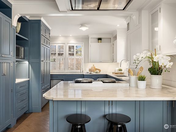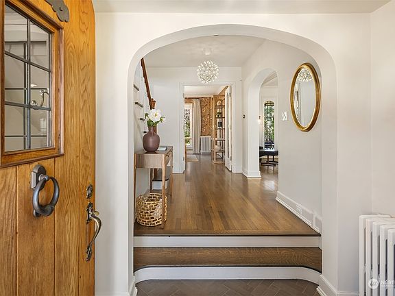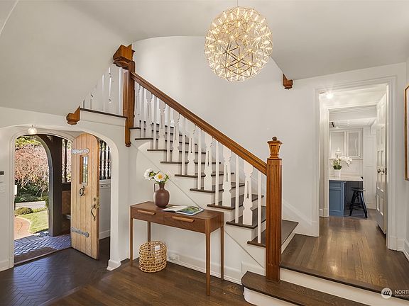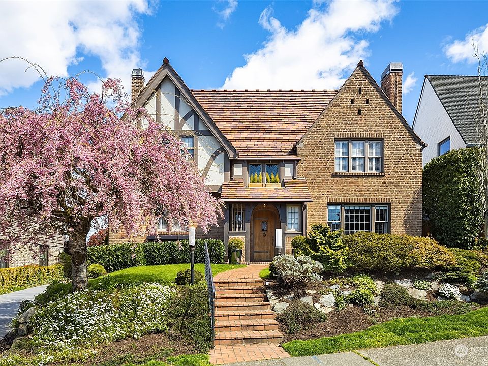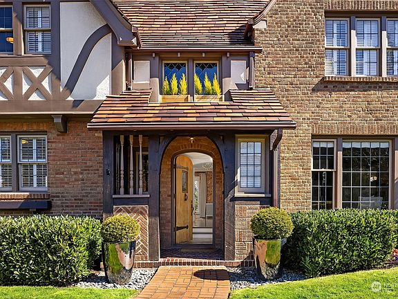 Storybook charm meets modern elegance in this timeless Tudor-style Broadmoor home. Remodeled in 2015; rounded arches and impeccable style throughout. Entertain in style with leaded-glass windows, Rumford fireplace, and tons of natural light in the living room. The dreamy kitchen boasts herringbone porcelain floors, marble countertops, breakfast nook & an AGA stove. Gorgeous formal dining room. The primary suite on the upper level has a wood-burning fireplace, walk-in closet, freestanding bath and W/D. Two additional bedrooms, regal office space, additional full bath. A/C, heated floors, detached 2-car garage with electric charging station, & enclosed backyard with level lawn — all in the heart of Seattle in the prized Broadmoor community!