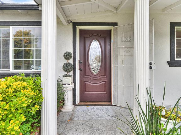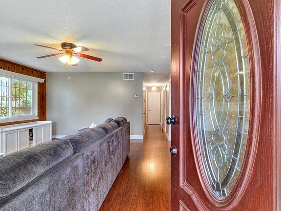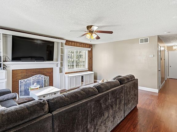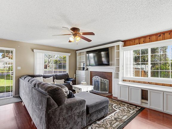 This welcoming corner lot home is framed by an elegant iron fence and mature trees, offering ample shade during those hot summer days. The good-sized front yard and an inviting front porch create a charming welcome as you approach the front door. Upon entering, the living room features a built-in entertainment center with extensive shelving and storage flanking the cozy fireplace. Large windows invite abundant natural light and offer pleasant views of the neighborhood. An open-concept design seamlessly connects the formal dining area and kitchen, which boasts generous storage and a sizable pantry. Step into the private backyard oasis, complete with various fruit trees, a charming garden area, and a tranquil small pond.