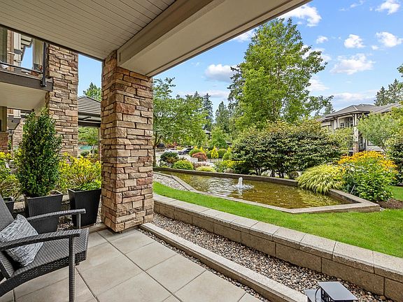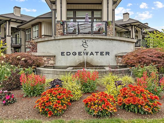 Welcome to Edgewater! Beautiful west-facing 2 Bed/2 Bath ground floor condo offers a peaceful escape with your main living and patio overlooking water feature of inner courtyard. Thoughtful layout with spacious kitchen, dining, living areas and bedrooms on opposite sides for privacy. Luxurious primary suite boasts a walk-in closet and spa-like ensuite with heated floors. High-end features include quartz and marble countertops, extra built-in cabinetry, 9’ ceilings, an electric fireplace, and an oversized kitchen island. Recent upgrades include new paint throughout, new washer/dryer, dishwasher, microwave. Resort living with pool/hot tub, gym, yoga, media & stunning entertainment lounge with breathtaking views, guest suite and gated walking paths. Includes 2 parking spaces! Move in ready!
