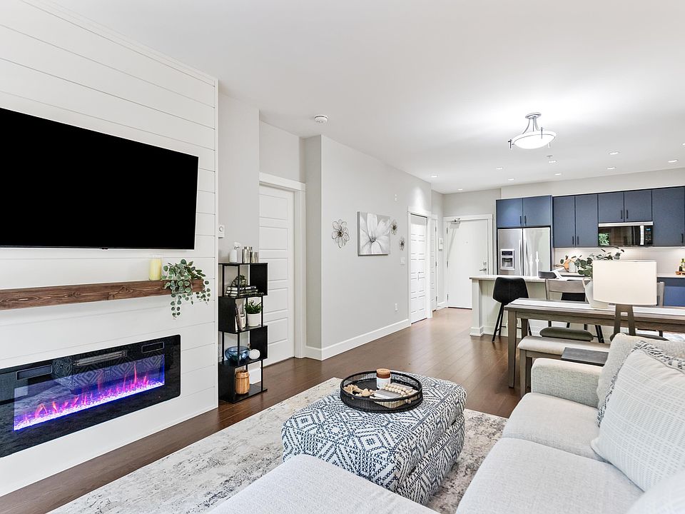 Welcome to Edgewater, South Surrey’s premier gated resort-style community! This beautifully updated 2-bedroom, 2-bath home features bedrooms on opposite sides for privacy and a spacious living area opening to a large covered deck. Updates include fresh paint, new kitchen cabinet doors, custom inserts, hardware, fridge cabinet, and walk-in pantry. The main bath has new counters, sink, and hardware, while the ensuite boasts a stunning walk-in shower with glass barn door plus refreshed cabinetry and laundry closet. A rebuilt floor-to-ceiling shiplap fireplace with modern mantle and electric insert completes the stylish space. Enjoy resort amenities—pool, hot tub, gym, theatre, guest suite—close to shops, golf, and major routes.