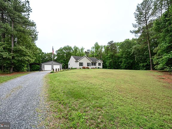 Are you dreaming of a peaceful escape to the countryside? Well, Imagine owning a beautiful and spacious home nestled on nearly three acres of serene land. This private retreat is surrounded by mature trees, creating a peaceful haven teeming with lots of wildlife. This well-maintained, open-floor rancher offers 3 bedrooms and 2.5 baths plus a den and office that could easily function as a fourth or even fifth bedroom. The beautiful kitchen boasts sleek white cabinetry, farm sink, a large island/breakfast bar and quartz countertops, adjoining dining room and a cozy living room complete with a pellet stove. You'll also appreciate the large laundry room, attic space for storage, a screened porch, and a patio, ideal for entertaining and/or relaxing. And that's not all! An exceptional bonus is an expansive 30x60 detached garage equipped with it's own electric meter, heat, air conditioning, and water. There's a two-car portion and a 30x35 space at the back, ready for you to customize to your liking (fantastic potential to convert into living space, such as an in-law suite). For extra storage and protection, there's also a large car/camper port. Come enjoy the Eastern Shore -fishing, crabbing piers, playgrounds, bike/walking trails, parks and so much more!