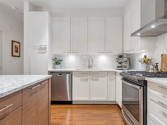 Welcome to this beautifully designed 2-bedroom, 2-bathroom unit, tucked away on the quiet side of the building for ultimate privacy. The home features a sleek, modern aesthetic with high-end finishes throughout. along with numerous upgrades. The Natural light pours into the open-concept living space, which is complemented by a stylish and cohesive color palette. The gourmet kitchen is a standout, showcasing a custom tile backsplash, a gas range, and premium appliances—perfect for both everyday meals and entertaining guests. Step outside onto your private, covered deck, where you can relax and enjoy views of a serene greenbelt. Storage locker and two side-by-side parking spots.