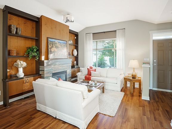 Gorgeous Townhouse stunning rancher w/ a walkout deck offers breathtaking views of the North Shore mountains, featuring a spacious main living area that seamlessly connects to a large patio. Perfect for indoor/outdoor entertaining & summer barbecues. Enjoy the charm of a the small garden area & the convenience of a double car garage. Inside, vaulted ceilings & built-in cabinets enhancing the elegant ambiance. Customized gas fireplace w/ beautiful stonework adds a cozy touch. The professionally designed kitchen boasts white stainless steel Fisher & Paykel appliances, a double drawer dishwasher, expansive quartz countertops, & under-mount cabinet lighting, entertainers island making this a chef's dream. This complex offers exceptional amenities and a beautiful move ready townhouse.