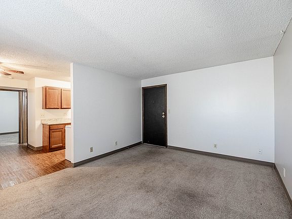 Off the dining area is the kitchen, which is equipped with full-sized appliances, including a dishwasher, and lots of cabinet and countertop space. Down the hallway are a full bathroom and the bedroom, which has two double-door closets.