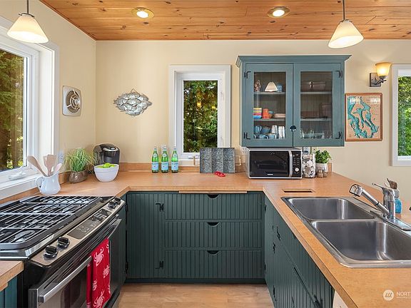 Indulge in the privacy of an island retreat! Saratoga Passage and Olympic Mountains, with whales and eagles alike, vie for your attention while the flat grassy yard beckons you to gather ripe apples + pears from the orchard. Inside, every space thoughtfully designed, maximizing the views while creating a relaxing setting. Charming kitchen opens to dining room with French Doors inviting you to the back deck + sunken firepit. Living room provides a cozy lounge with wood burning stove + abundant windows. Sleeping quarters upstairs, with two large bedrooms. Head down to your 83’ of beachfront to hunt for shells, bask in the sun, or simply read a book. With no ferry, a quick drive, and a gated entrance, your peaceful escape awaits!
