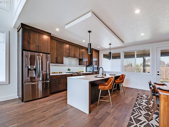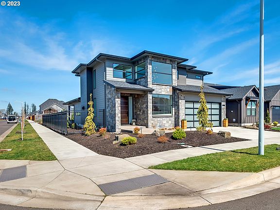 This executive home hits the key points of modern architecture: clean lines, open & versatile floor plan, with a focus on an entertaining vibe. Sitting in the Nines of N. Gilham, it boasts 4 BR+ office, main-level luxurious primary suite with WI tile shower & soaking tub, gourmet kitchen w/ waterfall countertop island, soaring 18' ceilings, & the impressive floating staircase tops it off. Backing to the community park, the covered patio emphasizes it's unique concrete fire table. Open house Sun. 4/30 2-4!