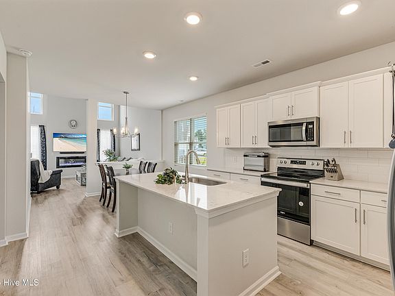 From the moment you walk in, you'll feel the openness — cathedral ceilings, natural light, and clean lines that make every space feel bigger. The kitchen is a showpiece with bright cabinetry, quartz counters, stainless steel appliances, and a huge island that brings everyone together. The built-in electric fireplace anchors the living area, setting the tone for cozy nights and effortless entertaining.
