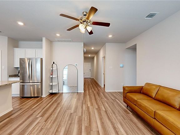 This contemporary single-story residence at 1519 Merritt St offers thoughtfully designed living space. The home boasts four bedrooms, including a spacious primary suite and well distributed living space. The heart of the home is an open-concept kitchen and living area, featuring crisp white cabinetry, granite countertops, and stainless steel appliances. Light wood-look flooring flows throughout the main living areas, creating a cohesive and airy atmosphere. The bedrooms are carpeted for comfort, while the bathrooms showcase modern fixtures and tiled floors. A dedicated laundry room with front-loading washer and dryer adds convenience. The dining area, adorned with a stylish light fixture, offers direct access to the outdoor space. Large windows and neutral wall colors contribute to the bright, inviting ambiance. Storage solutions include a walk-in closet with built-in shelving. This practical home combines functionality with contemporary aesthetics, perfect for modern living.