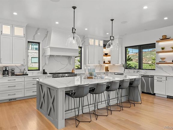 Welcome to The Charm House, situated high above the city where the foothills invite you into a world of serene sophistication. This custom-crafted residence offers an elevated lifestyle shaped by its inspiring natural surroundings and refined design. Step into the great room, where a wall of windows reveals the home’s panoramic views in full splendor, washing the space in natural light. Soaring ceilings and impeccable finishes set the tone for a home that is as much a retreat as it is a statement. The heart of the home lies in its extraordinary kitchen, crafted for those who love to cook and love to gather. With a built-in ice-maker (featuring coveted "Sonic" ice), a 48" range, dual dishwashers and abundant counter space, every thoughtful detail enhances both its function and beauty. The primary suite offers a haven of calm and comfort: a fireplace-warmed sitting area, coffered ceilings, custom walk-in closet and an enviable bathroom that boasts dual shower heads & a sculptural soaking tub. French doors lead to a private patio ideal for a future hot tub, where morning sunrises and star-filled nights will become part of your daily rhythm. Upstairs, 3 ensuite bedrooms offer privacy & comfort for family or guests. One of these suites includes a sitting area that makes it ideal for a second primary or luxurious guest quarters. Restoration Hardware lighting and high-end finishes throughout lend quiet luxury to every space. The unfinished, partial walk-out basement is already plumbed for two additional bathrooms, awaiting your vision for future expansion. The covered outdoor kitchen, living area, stone fireplace & integrated TV wiring create the perfect setting for year-round entertaining. A beautifully lit waterwall offers a tranquil backdrop for relaxing after dark. Set on 3/4 of an acre in the desirable Montane subdivision, minutes from Red Rocks Country Club & its scenic golf course, this home is cradled by miles of trails yet only moments from the energy of the city.