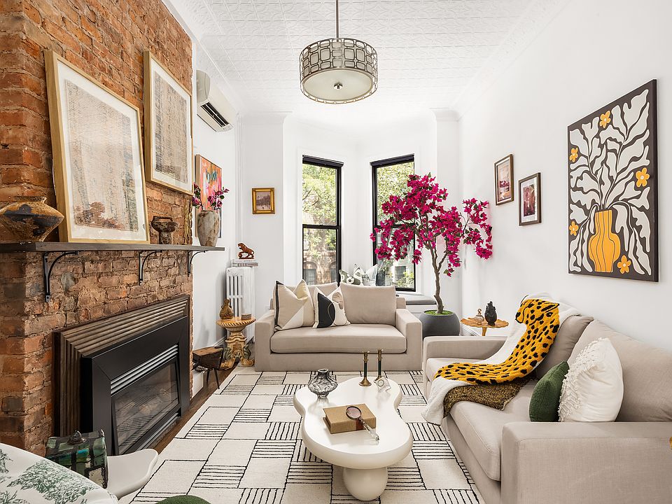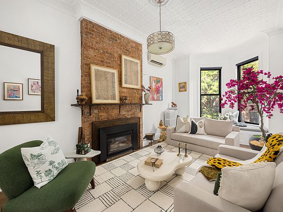 The open-concept layout continues into a charming living room, illuminated by bay windows that overlook the leafy streets and townhouses below. A striking exposed brick accent wall frames a gas fireplace, adding warmth and character. A custom wood mantle with iron brackets lends a touch of industrial elegance, while hardwood floors, original beautifully maintained tin ceilings, and clean lines create a seamless blend of historic charm and contemporary style.