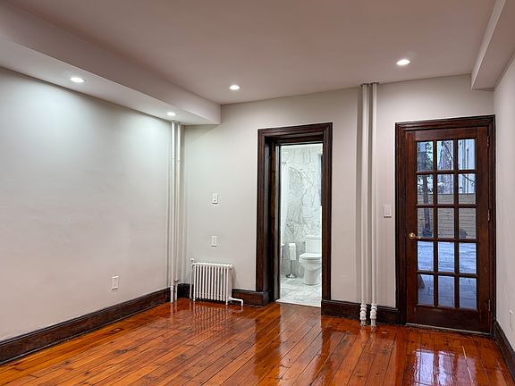 This is a garden-level two-bedroom, two-bath apartment with a shared backyard. As you enter the apartment, you'll find a storage area under the stoop for your bikes. As you enter the double doors, a common hallway leads to the basement, where washer-dryer hookups are ready to go. Bring your own W/D!