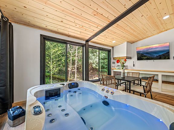 Step into this Dolly Parton-inspired retreat where cozy meets glam! The cabin is 927 sq ft of carefully curated charm, designed to make you feel right at home in the Smoky Mountains. The first floor features an open-concept living room with bright windows and comfy seating, a fully equipped kitchen, a built-in breakfast nook, and a half bathroom. The real showstopper is the sunroom, complete with a private hot tub, floor-to-ceiling windows, a dining table, smart TV, and a grilling station. It's the perfect spot to sip coffee in the morning or unwind under the stars. Upstairs, you'll find the spacious master suite with a plush king-size bed, a second smart TV, and stunning views of the surrounding forest. The en suite bathroom has a walk-in shower and all the essentials for a comfortable stay. Outside, relax on the front porch in classic Smoky Mountain style with rocking chairs and peaceful views. Guests also have access to a shared outdoor fire pit area and a charming kids' playhouse just a short stroll away. Whether you're here to explore the trails or just soak in some Dolly-style joy, this cozy cabin has everything you need for a magical mountain escape.