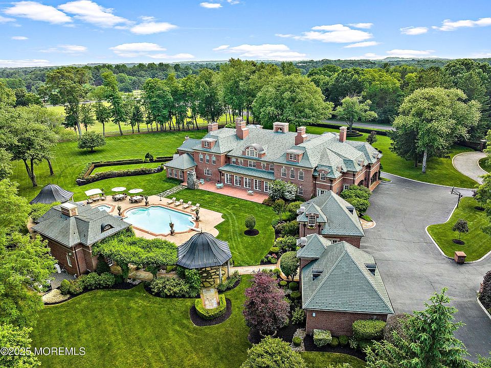 The estate's outdoor areas are equally spectacular. Impeccably landscaped grounds, considered among the best in New Jersey, surround a pool, spa, outdoor kitchen under a charming cabana, and an outdoor fireplace. A separate two-bedroom, two-bath pool house with a complete kitchen and basement adds to the property's allure.