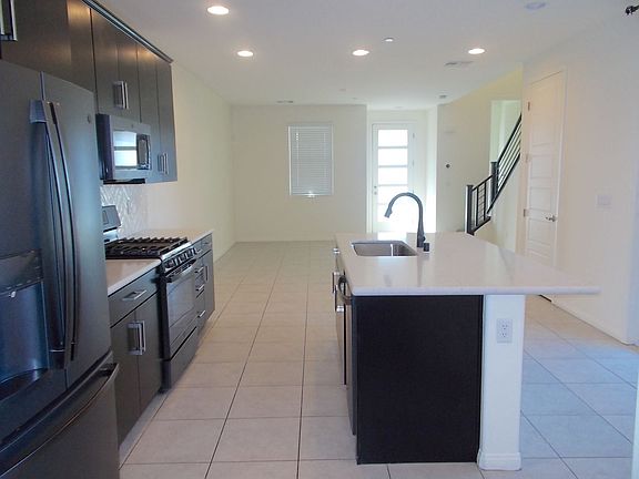 The modern kitchen boasts a large center island, recessed lighting, granite countertops, a stylish tile backsplash, and upgraded black stainless steel appliancesideal for any home chef.