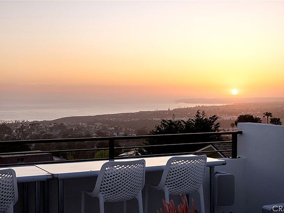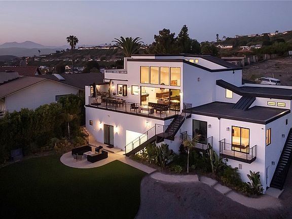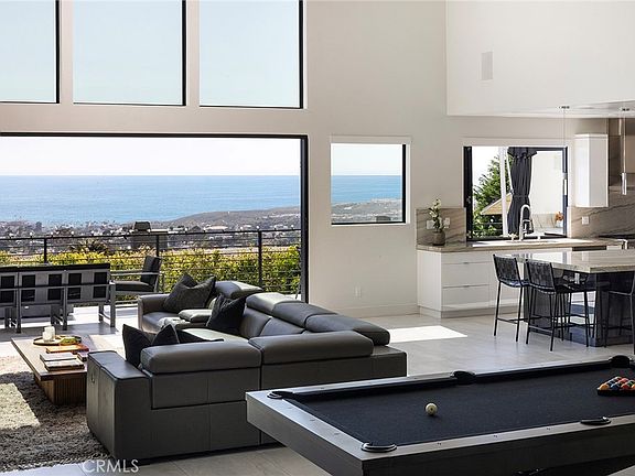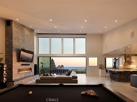 Completed in 2021, this architecturally significant residence in one of San Clemente’s most coveted hillside enclaves captures the essence of contemporary coastal life. Designed by noted architect Robert A. Hall, the home is a symphony of scale, light, and craftsmanship—each space unfolding with intention, intimacy, and awe. Set on a prime 16,777-square-foot cul-de-sac lot, its elevated position commands sweeping vistas of the Pacific Ocean, Catalina Island, fiery sunsets, snow-dusted peaks, city lights, and fireworks above the San Clemente Pier. Behind a custom African mahogany door, the approximately 4,849-square-foot interior opens with a soaring double-height foyer and unfolds into a gallery-like great room with 17-foot ceilings, a 76-inch linear fireplace, 20' x 8' foldaway glass doors, a 250-gallon saltwater aquarium, and a walk-in wet bar—blurring the line between indoor and ocean-facing outdoor living. The formal dining area glows with custom LED lighting and flows into a designer kitchen featuring Monogram appliances, sleek white cabinetry, solid stone countertops, a butler’s pantry with wine fridge, oversized island, and a fold-away pass-thru window to the terrace. Five ensuite bedrooms—including a guest casita and two suites with ocean-view balconies—offer refined retreats, while floating stairs framed in glass with wave-pattern railings lead to a stunning primary suite with a private view terrace, linear fireplace, and spa-inspired bath with jetted tub, skylit oversized shower, and boutique-style walk-in closet. Amenities include a dumbwaiter, Savant whole-house AV system, PEX plumbing, central vacuum, water softening and filtration systems, and a standing-seam metal roof. The freshly painted exterior, tropical landscaping with curated lighting, gated front yard, and private backyard offer a beautiful canvas for a future pool, spa, or ADU. This is more than a residence—it is a rare convergence of design, location, and lifestyle, crafted for those who see home as both refuge and revelation.
