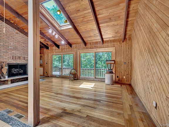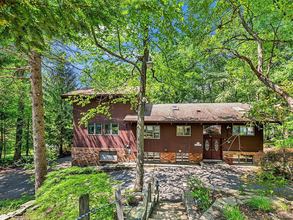 Nestled among the trees in the sought-after Laurel Ridge community, this custom home blends rustic charm with contemporary design. Featuring 5 bedrooms and 3 full baths, it offers a spacious, open floor plan perfect for both entertaining and embracing the tranquility of nature. At the heart of the home lies a stunning living room, where SOARING CATHEDRAL CEILINGS, a WOOD-BURNING FIREPLACE , and OVERSIZED WINDOWS create a grand yet inviting atmosphere. Abundant NATURAL LIGHT pours in, illuminating every corner. GLASS SLIDERS lead seamlessly to a SPRAWLING OUTDOOR DECK, perfect for relaxing or entertaining under the open sky. The living room flows into an OPEN CONCEPT KITCHEN with wood cabinetry, LARGE GRANITE CENTER ISLAND and large seating area. The adjacent GREAT ROOM offers banquet-sized dining, ideal for hosting large gatherings and unforgettable celebrations—while also serving as a versatile space for creativity and everyday living. The lower-level FAMILY ROOM features the 2nd FIREPLACE with dramatic NATURAL STONE and opens directly onto the patio and backyard area—perfect for cozy evenings and outdoor enjoyment. There is a BEDROOM on the MAIN LIVING AREA providing privacy and comfort, while HARDWOOD FLOORS, SKYLIGHTS GALORE AND THE WARMTH OF NATURAL WOOD grace the home throughout.The PRIVATE THIRD LEVEL is currently used as the primary bedroom with a full bath, but offers EXCEPTIONAL FLEXIBILITY—easily transforming into a home office, photographer’s studio, writer’s retreat, or whatever creative space you envision. ADDITIONAL DETACHED GARAGE can also function as extra storage or workspace. A beautifully landscaped NATURAL ROCK GARDEN enhances the front of the home, gently sloping down along the driveway, adding texture, charm, and curb appeal to the property’s welcoming entrance. With public utilities, this home balances comfort and practicality. The Laurel Ridge community also offers amenities including a TENNIS COURT, PLAYGROUND and BASEBALL FIELD. Hiking trails, outdoor activities, restaurants and plenty of shopping are within a short distance. Come breathe in the clean, fresh air and discover the serenity of your own private country escape. Close to Rockland and Bergen Counties, easy NYC commute, award winning Monroe-Woodbury Schools.