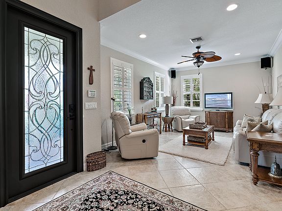 Large, waterview corner lot in Canterbury Place with resort style heated pool and spa. With 4 bedrooms/3.5 baths, this Wicklow model features a spacious downstairs Master bedroom, gourmet kitchen with granite counters, dual wall ovens, plantation shutters throughout, impact windows/doors, upgraded lighting inside and out, travertine pool deck w/built-in serving center, and lush landscaping. Two separate, 3-year-old, high-efficiency HVAC systems for upstairs and downstairs. Monthly electric bills are only $20 to $30 due to 16.2 KW solar system and special water heater. Other exceptional upgrades: hardwired 7-camera security system, surround sound inside and outside, transfer switch for emergency power, and digitally controlled pool lighting. Move in ready, this won't last!