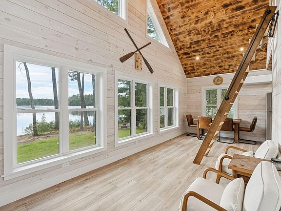 Secluded private coveExpansive privacyCustom burnt cathedral ceilingsWhite-washed pine wallsEfficient heat pumpLevel shorelineLarge windows