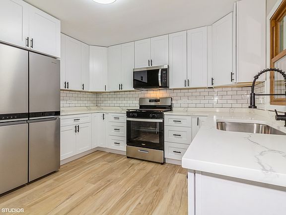 Welcome Home! This fully updated ranch is awaiting its new owner. Nestled on a large lot just one block from the beautiful Fox River. Entering the home you'll be greeted by a large living room with an abundance of natural light, fresh paint, and luxury vinyl floors. The kitchen is a show stopper with custom 42" white cabinets, quartz counter tops, and subway tile backsplash, brand new appliances, and a custom buffet area with matching counter tops and cabinets.   Updated full bathroom with custom vanity with quartz tops and updated light fixtures. The three bedrooms are of ample size with the primary bedroom being 14x13 in size with large closet. The finished basement offers unlimited possibilities with a HUGE finished recreation room (15x40) and new carpet. Basement also offers an updated full bathroom and oversize laundry room with additional storage space. One car attached garage with attic access.   Covered back patio. Large fenced in back yard with 2 additional storage sheds. Don't wait on this one! Schedule a showing TODAY! Broker owned interest.