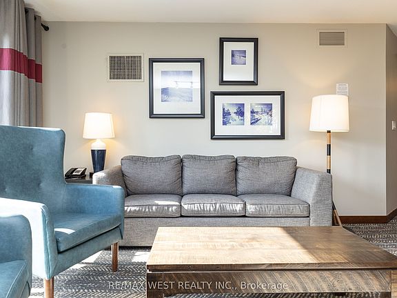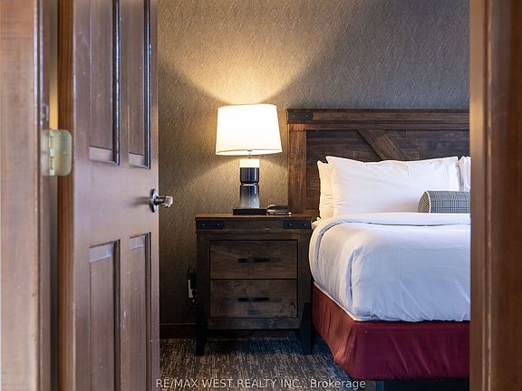 CORNER SUITE SLOPE-SIDE! Rarely offered corner suite right at the base of the Silver Bullet Chair Lift, this fully furnished 2-bedroom, 2-bathroom in the popular low-rise Weider Lodge offers over 1,000 sq. ft. of bright, open-concept living with spectacular views of the ski hill, pool, and Village. The oversized deck is a true highlight, offering beautiful views of the Weider Lodge pool and Village pond, with partial tree coverage that provides natural privacy while still providing a resort atmosphere.The spacious layout features a full kitchen, two generous bedrooms, and two full bathrooms, making it perfect for family getaways & generating income. The suite participates in the Blue Mountain Village Rental Program, generating strong, consistent returns (grossing over $70,000 annually) while still allowing generous owner use (10 days per month).Enjoy full access to resort-style amenities, including an outdoor seasonal pool, year-round hot tub, fitness centre, sauna, owner ski locker, underground parking, and 24-hour front desk service. Condo fees include all utilities. HST may be applicable (can be deferred with an HST number). A 2% + HST Blue Mountain Village Association entry fee applies on closing, with an annual BMVA fee of $1.08 + HST per sq. ft.