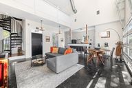 Clean linesAiry two-story homeBright expansive feelTwo off-street parking spacesSculptural spiral staircaseOpen layoutVertical storage
