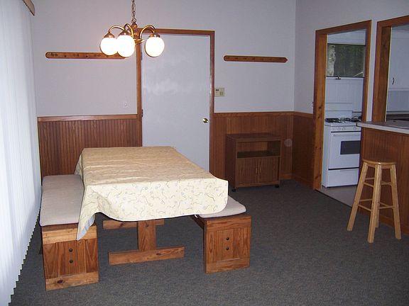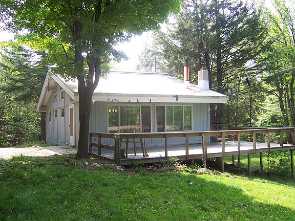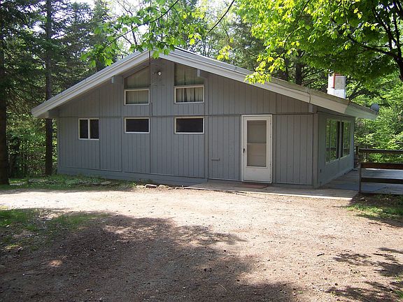 Well maintained 2 bedroom plus loft 1 bath chalet nestled in the woods. Woodstove on hearth in the living room. Relax on wrap around deck. 16x10 shed. Circular drive. Over the years many improvements: septic installed in 2005, roof replaced, new range, woodstove, well, oil hot air furnace and sheetrock on the walls. Recently new carpeting, linoleum in the kitchen/bathroom and freshly painted.