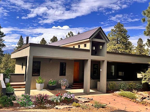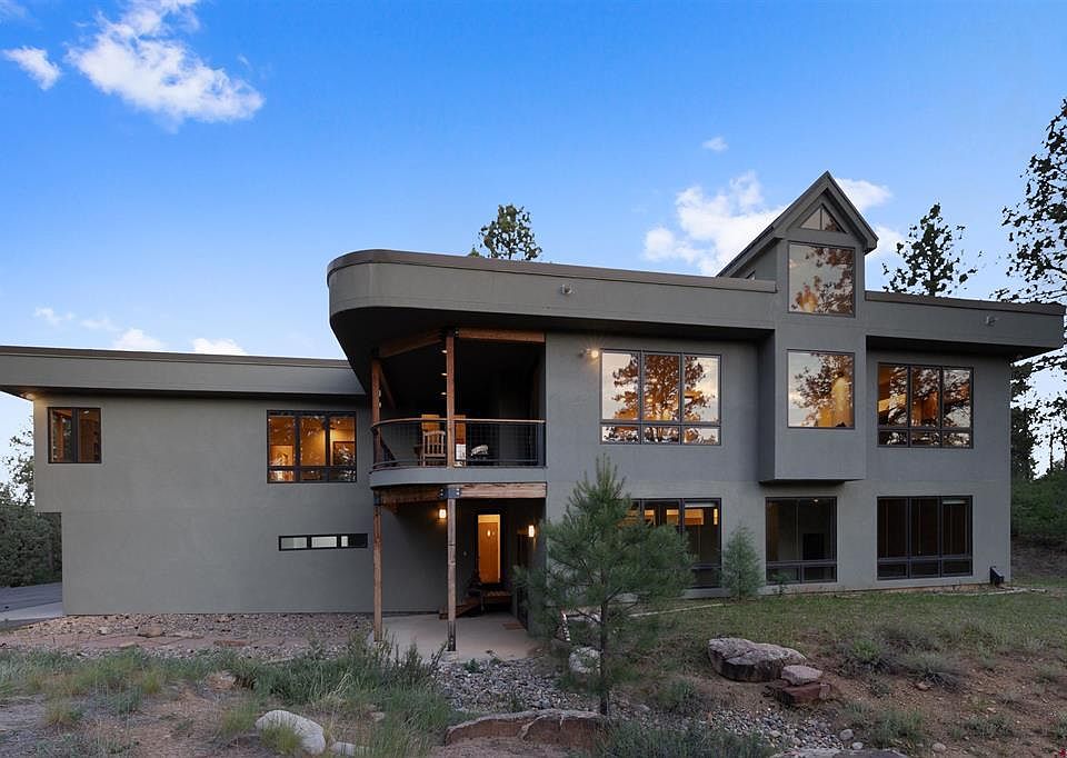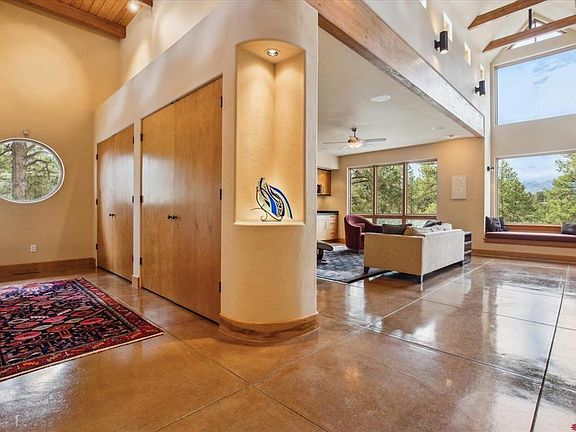 Welcome to this meticulously crafted 4,397 sq ft residence, gracefully set on 11.26 acres within a private, gated enclave of just six homes. Designed by renowned architect Dallas Reynolds, built by Gary Whalen, and blessed by Eddie and Betty Box of the Southern Ute Tribe, this exceptional property masterfully blends artistry, functionality, with the unique feature of an elevator, and comfort in every thoughtful detail. A flagstone patio and circular paved driveway create an inviting approach to this one-of-a-kind home. The main level opens to an elegant foyer, which leads to the open living room and kitchen offering tranquil views of the Ponderosa pines and the La Plata Mountains beyond. Art niches with recessed lighting provide subtle design accents throughout. Off the main hallway you'll find a private office, a convenient half bath, and a spacious laundry room complete with a utility sink. The primary suite serves as a luxurious retreat, featuring an attached library and dual en-suite bathrooms—each with its own vanity and walk-in closet—connected by a custom-tiled walk-in shower, heated Toto toilet with bidet, and a relaxing whirlpool bathtub. A king-sized bed with custom headboard, accent lighting, and matching side tables remains with the home, having been designed specifically to complement the space. The chef’s kitchen is appointed with mahogany floors crafted from reclaimed Indonesian railroad ties, double wall ovens, a warming drawer, a five-burner cooktop with downdraft vent, microwave, and a double-drawer Fisher-Paykel dishwasher. Custom cherry cabinetry and tile countertops with two butcher block insets add both beauty and practicality. A covered deck—piped for a gas grill—offers the perfect setting for outdoor dining. The adjacent living room features a wood-burning fireplace with raised hearth, wet bar, and integrated ceiling speakers connected to a central hub for whole-home audio. An elevator conveniently services both levels of the home, enhancing accessibility and ease of living. Step lights along the staircase and dimmer switches throughout ensure comfort and ambiance. The lower level includes two additional bedrooms, each with a private sink, vanity, marble shelf, and thoughtfully placed reading lights above the beds. A full shared bathroom is located between them. One of the home’s standout features is the expansive studio space—an inspiring environment for an artist, physical trainer, home gym, or any skilled professional—flooded with natural light from a wall of windows overlooking the peaceful pines. This space includes its own sink and offers endless potential as a creative workshop, fitness studio, dance room, game room, or additional living room. Throughout the home, stained and polished concrete floors with in-floor radiant heat are paired with a separate forced-air cooling system for year-round comfort. Additional features include a central vacuum system, under-stair storage, and a variety of custom built-ins designed for both beauty and functionality. The attached three-car garage includes a dedicated workshop bay equipped with multiple outlets, 220V power, an air compressor (included with the home), and newly finished epoxy flooring. A detached one-car garage with 220V power provides the perfect setup for woodworking or additional hobbies, complemented by an adjacent rear storage shed for tools and equipment. Set within a peaceful, well-maintained gated community with reliable road care and snow removal, this property ensures effortless year-round access and ease of living. Nature lovers will appreciate the abundant wildlife right outside the door, while enjoying the recreational amenities of nearby Lake Nighthorse and conveniences of historic downtown Durango, both just minutes away. Call to schedule a tour of this immaculate and beautifully designed and crafted home offered for the first time from the original owners.