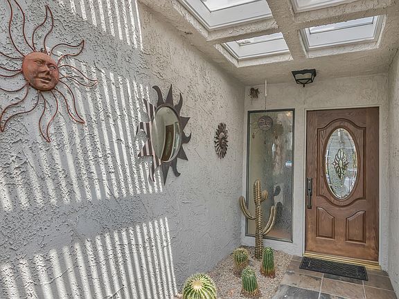 Desert living, at its finest in south Palm Springs, in Vista Canyon. The wonderful location of this home brings the outside in with spectacular mountain views.The large open floor plan connects you to a dining area, livingroom, fireplace, wet bar, high ceilings with 3 skylights, and tall wood framed doors and glass, all looking out to a relaxing patio. The master suite, den/second bedroom also have outdoor patios. There is a powder room off the livingroom. The upstairs bedroom and bath have a deck with amazing south/east mountain and desert views. The nice bright kitchen also has a dining area with a sliding door going out to a patio with a built in BBQ. This home has ample storage including a 2 car garage with a laundry room. This complex is gated on land you own. A solar system has been installed and is owned. There are 29 homes, 2 pools and spas, and a tennis court. It is close to hiking trails, golf, shopping and downtown Palm Springs. The beauty of the complex is accented by the magnificent desertscape and brick pavers throughout.