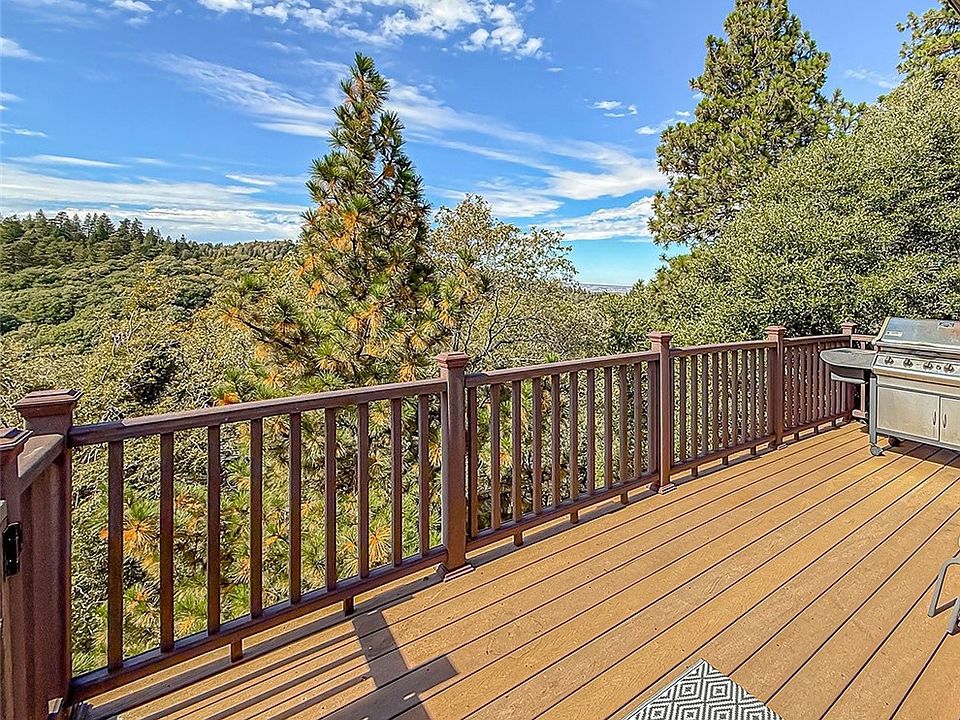 Enjoy stargazing and entertaining on the expansive 840 sq. foot Douglas Fir deck, complete with a gigantic outdoor TV, cozy furniture, and Trex decks on the backside of house with a 5-person hot tub. Inside, you'll find a warm and inviting open-concept main floor with hickory hardwood floors and tongue-and-groove pine ceilings in entry, living room, dining room and kitchen. Kitchen has 6-burner stove and wine fridge installed in the island. Additional wine storage in downstairs closet.