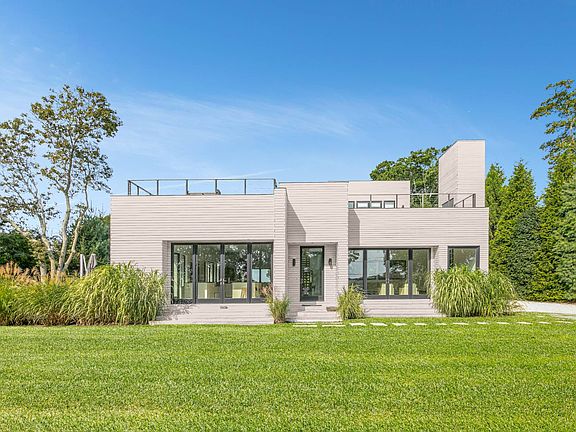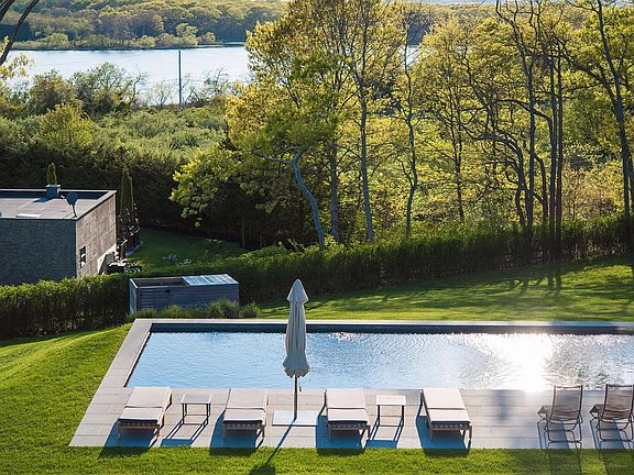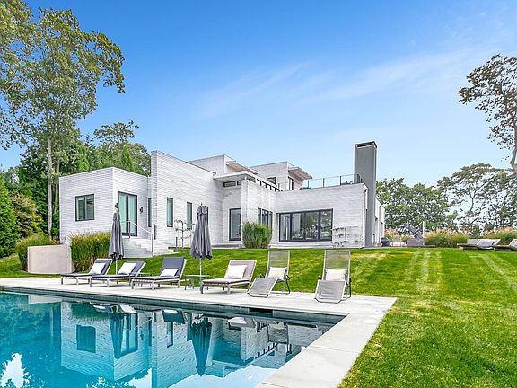 Get ready to be wowed. This modernist estate is perched on the only hilltop in miles, with breathtaking views of Poxabogue Pond and Wolffer Vineyards. The front door opens onto a 70' entrance gallery with soaring ceilings and almost 6,500 square feet of interior living space on three levels. The fully equipped chef's kitchen is completely open to the dining and living areas, with walls of glass on all sides. French doors surround the three kitchen islands and provide easy access to outdoor dining and gathering around the outdoor fireplace. Across the entrance gallery, a warm and welcoming formal living room positions your view squarely on the vast vineyards beyond. The western wing of this floor offers three guest suites, including one very private mini-primary, with French doors to the pool area. There is also a powder room, laundry room, and attached two car garage. The upper floor features a gigantic primary suite with huge walk-in closet, second laundry and a spa-like bathroom, opening onto an outdoor shower and two private decks with outdoor fireplace. Completing the upper level, there are French doors leading from the top of the stairs to almost 2,000 square feet of public terrace, with magnificent sunset views, perfect for entertaining one visitor or 100 close friends. The lower level is flooded with light, thanks to sliding doors leading to the 42' heated gunite pool. Inside, guests will find a Cabana room, with full bar. The lower level also offers a spacious media room, two bedrooms which share a bath, and an exercise area, all connected to the main floor by grand hallways and a floating staircase. The pool is surrounded by lush landscaping, all on one acre. The home is centrally located, in the coveted Village of Sagaponack, just north of Pike farm-stand and Loaves and Fishes.