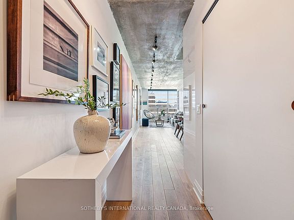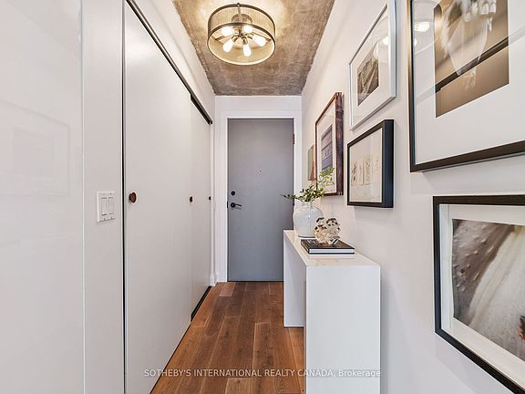 Presenting the Artisan- for the ones who don't just live in the city they move through it with purpose and presence. This downtown space hits different. Concrete ceilings that refuse to be covered. Oak floors that don't just lie there they lead. Solid wood doors throughout add weight, warmth, and intent. A foyer that offers an actual sense of arrival (not a front door that dumps you into the kitchen!). This is architecture with intention.Fully reimagined and renovated with permission, this home doesn't beg for attention it owns the room. The kitchen? A two-tone, chef-caliber command centre with flawless integrated appliances, under-cabinet lighting for late-night ambiance, and storage so well-integrated, it blends seamlessly into the design. Whether hosting a lively gathering or having a quiet evening in, this space effortlessly captivates. Living room = multifunctional brilliance. A custom wall unit with a Murphy bed that disappears when you need space, and reappears when guests do. Perfectly executed, without compromising style.The bathroom floats literally. The vanity hovers, the built-in nooks keep it all clean, and the design? Not trying too hard. Just doing everything right.This place doesn't follow trends. It makes statements. Bold ones. Clean ones. Edgy ones. It's made for someone who knows who they are and who wouldn't dream of settling for open concept beige.Location Right in the heartbeat of Toronto's most artistic and culturally electric neighbourhood. The Artisan puts you a heartbeat from Grange Park, Baldwin Street's cult-fave cafés, Queen Wests creative edge, U of T, OCAD, Toronto Metropoltan University, the Financial District, St. Patrick Subway, and Hospital Row. Whether you're out or in, this is what central is supposed to feel like.Main character energy? Absolutely. NOTE: Living room is now in the den area, which includes a wall bed. This could easily convert into a 2 bedroom