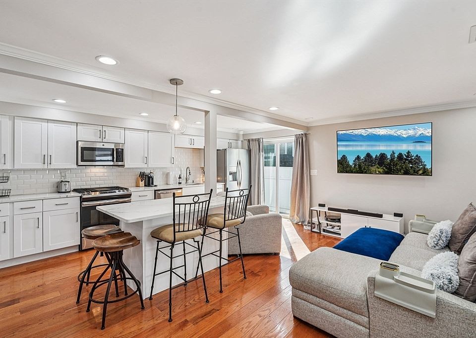A city retreat like no other. This rare 4-level single-family redefines East Boston living with 3 bedrooms, 2.5 baths, and nearly 2,000 sqft including a finished lower level. Completely gut renovated in 2019, everything from the windows, siding, and roof to the kitchen, heating system, tankless hot water, electric panel, and everything in between was replaced. Designed for modern lifestyles, the open main floor features hardwoods, a chef’s kitchen with quartz counters, stainless appliances, a center island with wine fridge, and direct access to a private enclosed deck for seamless indoor-outdoor living. The top-floor primary suite offers a spa-style bath and custom walk-in closet; marble-tiled baths, glass shower doors, and central AC elevate comfort throughout. On a quiet street just minutes to the Airport Blue Line and close to Logan, downtown, I-90, and Route 1A. With acclaimed dining, shops, harbor trails, beaches, and parks nearby, this spacious, stylish home is truly a must-see.