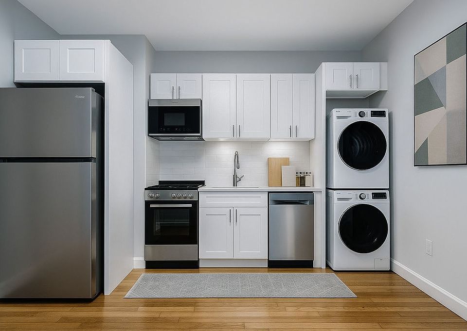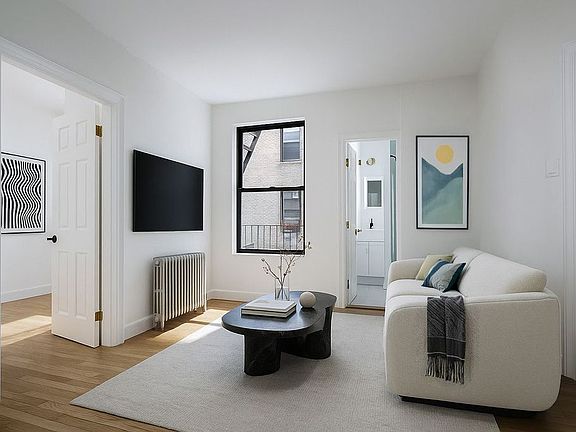 Large closets, high ceilings, beautiful exposed brick, and rich hardwood floors carry throughout the entire apartment. The newly renovated kitchen is outfitted with new stainless steel appliances, dishwasher, white-tile backsplash, white wooden cabinetry, and white-quartz countertops opening to a comfortable living space. Around the corner and through the front foyer is a meticulously crafted bathroom with tasteful white and black tile, modern fixtures and polished silver hardware.
