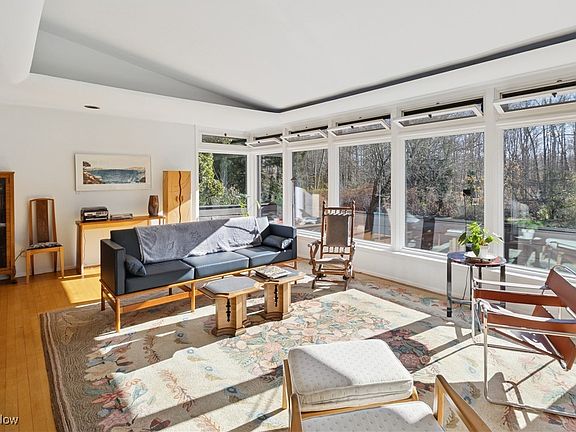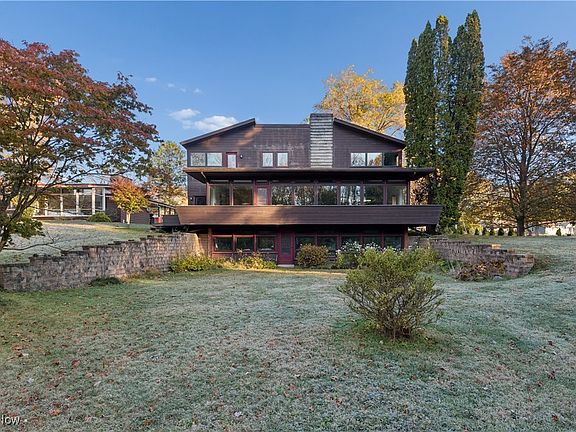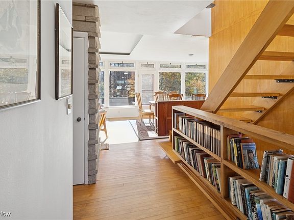 Designed by Oberlin architects Mark Ratner and Douglas Johnson, this mid-century modern classic built in 1952 is a must-see! Located within walking distance of downtown and the college campus, the home offers seamless access to the Northcoast Inland BikeTrail and highways leading to Cleveland. An inviting geometric boardwalk guides you to the entry foyer defined by a striking open-riser staircase and built-in display shelves. Inside, the home balances open flow of gathering spaces with intimate spaces and rooms for quietude and creativity. The spacious living area is anchored by a dramatic floor-to-ceiling stone fireplace that provides warmth and texture against the sleek hardwood floors. A stunning array of south-facing picture windows with operable transom windows, floods the space with natural light, provides cross-ventilation, and frames the beauty of the woods along Plum Creek. The home is designed for connection with nature, featuring a unique wraparound balcony that spans the entire southern facade for all-season outdoor enjoyment. The spacious eat-in kitchen features a high-top island, plenty of cabinets, custom art backsplashes, and patio doors leading to a south and west facing dining deck. Upstairs, the home features a significant addition designed by the artist owner; this level accommodates two spacious bedrooms and built-ins with the owner’s signature geometric details that honor the original architecture. The lower level features two bedrooms, each with an access to an independent full bath, and share a lobby opening onto a secluded stone-walled terrace. Don't miss this chance to see this architectural gem—schedule your virtual or in-person tour today!
