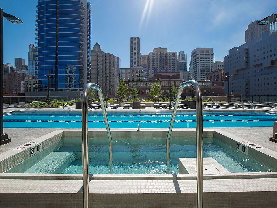 -Rooftop pool with sundeck and cabanas overlooking the skyline