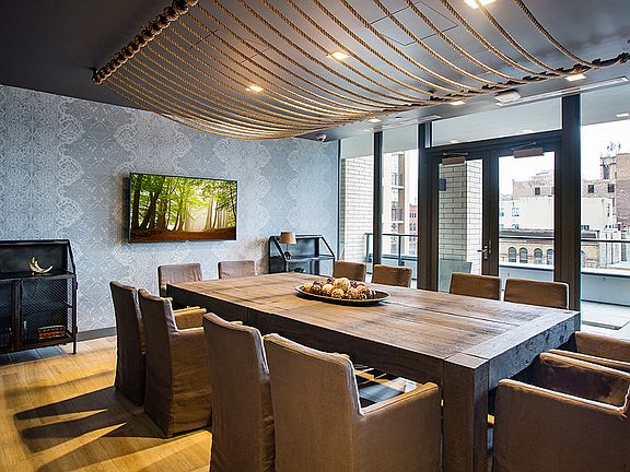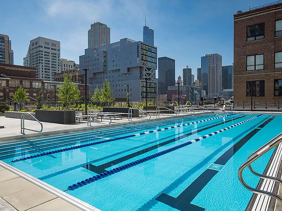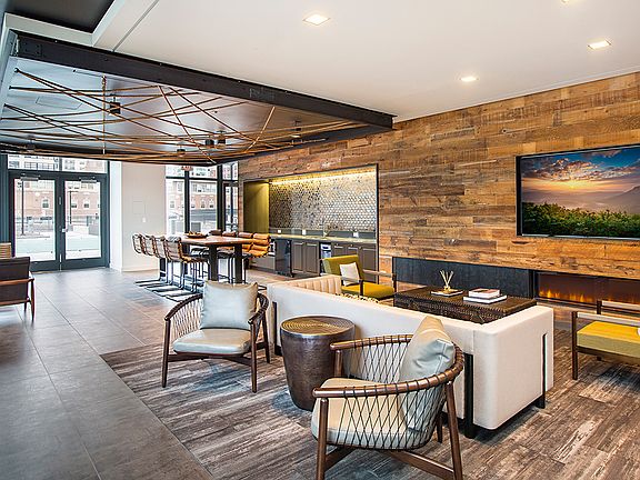 Enjoy resort-style amenities including a rooftop pool and sundeck, fitness center with yoga studio, resident lounge with co-working areas, outdoor grills and fire pits, 24-hour door staff, pet spa and dog run, and secure garage parking.