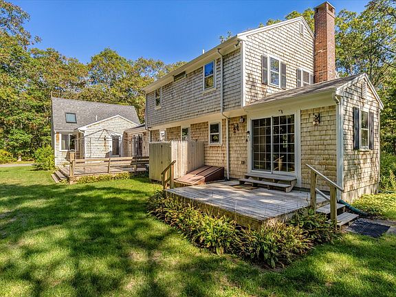 Welcome to 152 Wakeby Road - A Hidden Gem in a Tranquil Setting. Tucked among mature trees and blooming shrubs, this expansive, well-maintained property offers privacy, charm, and versatility. Walk up the steps of the farmer's porch and into the main home which features three bedrooms, bonus room, a full bath, a half bath with laundry. The eat-in kitchen opens to a cozy living room, and a sun-filled family room extends the living space with a nook ideal for a home office. The family apartment is perfect for guests, family, or possible rental with town approval. This private unit has its own utilities, a full bath, two Murphy beds, a loft, and ample natural light. Not to mention a separate driveway and private basement.Enjoy outdoor living on the spacious back deck with built-in seating and a gazebo. Two sheds (one with electricity) add flexible storage. The flat backyard, bordered by conservation land, creates a peaceful retreat.