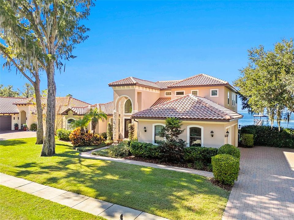 Pavered lanaiOpen-concept layoutElegant tray accentsStunning water viewsTile roofFormal dining roomCrown molding