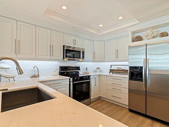 Welcome to Coastal Chic!! This beautiful fully updated condo with southwest exposure has stunning sunsets everyday & views all the way down the beach. Luxury vinyl planking throughout makes for easy maintenance. Gourmet's delight eat-in kitchen has white shaker cabinets with marble tops & under cabinet lighting. Siemen's SS range, microwave & dishwasher with Whirlpool refrigerator. Breakfast bar opens to the living/dining room. Living room has shiplap accent wall. Popcorn removed from all ceilings. Designer fans & lighting throughout. Plantation shutters at every window & door. All interior doors replaced & updated trim with wide baseboards.. This split bedroom plan affords everyone their privacy. Guest bedroom has a shiplap accent wall along with large walk-in closet. Guest bath also has big tile -in shower. Both baths have custom wood vanities. Primary bedroom & lviing room have sliders that open to spacious balcony. Great for having a cool drink & watching the dolphin at play. Primary bathroom has wood vanity with double sinks, large jetted tub & nice tile shower. Huge walk-in closet. Designer furniture & furnishings included in sale. Fully turnkey. Just bring your toothbrush, bathing suit & flip flops. Coveted DEEDED PRIVATE GARAGE #18 in parking garage. A/C 2023 & water heater 2024. The Ultimar is a world class condo complex on Sand Key of famous Clearwater Beach. Miles of pure white sand. Lush tropical landscaped grounds are expertly maintained. 24 hr guard gated. True Resort Style complex has 3 geo thermal heated pools w/spas, 3 tennis courts, pickle ball, basketball ct, putting green, croquet lawn, grill area, firepit area, shuffleboard, corn hole, gym, steam & sauna, billiards rm, media rm, social rm with catering kitchen and baby grand piano. Walk to great restaurants & shops or catch the Beach Trolley right out in front of the building. A short drive to Tampa & the airport plus all of the sports venues of our championship teams. START LIVING THE FLORIDA BEACH LIFESTYLE TODAY!! Buyer to verify room dimensions. See Video. Call to make an appointment for your private viewing today!