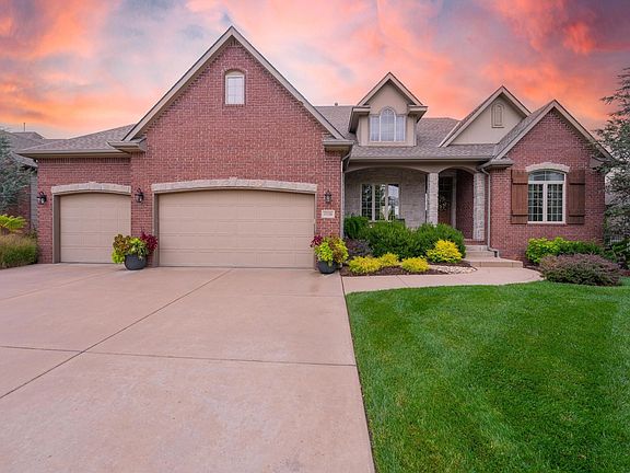 Welcome to your dream home! This stunning 5-bedroom, 3.5-bath home - crafted by the highly regarded Fahsholtz Construction - features a thoughtfully designed split-bedroom floor plan with luxurious finishes throughout. Step inside to soaring 10' ceilings, abundant natural light, and rich knotty alder wood cabinetry and trim. The formal dining and living rooms provide elegant spaces for entertaining, while the open-concept kitchen and family room create a warm, inviting hub for everyday living. The family room boasts a coffered ceiling, built-in bookcases, and a striking stone fireplace. A chef's dream, the expansive kitchen offers a large island with eating bar, walk-in pantry, custom vent hood, under-cabinet lighting, gas range, and beautifully refinished hardwood floors. Retreat to the spacious primary suite featuring a barreled ceiling with LED accent lighting, ample room for a king-sized bed and furnishings, and a spa-like en-suite bath. Enjoy double sinks, a soaking tub, a dual-head walk-in shower, private water closet, and a large walk-in closet. The main floor is completed by two additional bedrooms and a full bath. Downstairs, you'll find a generous game area, cozy family room with fireplace, two more bedrooms, 1.5 bathrooms, and a large storage room. The basement is also prepped for a full wet bar - plumbed and wired, just waiting for your custom touch. Extend your living space outdoors with a spacious, covered deck featuring a dual-sided fireplace and wall-mounted TV - perfect for year-round relaxation or entertaining. Located in the sought-after Andover School District with Sedgwick County taxes and low remaining specials. Don't miss your chance to call this exceptional property home for years to come! Proudly presented by Shane Pullman and Berkshire Hathaway PenFed Realty, call today for your private showing!