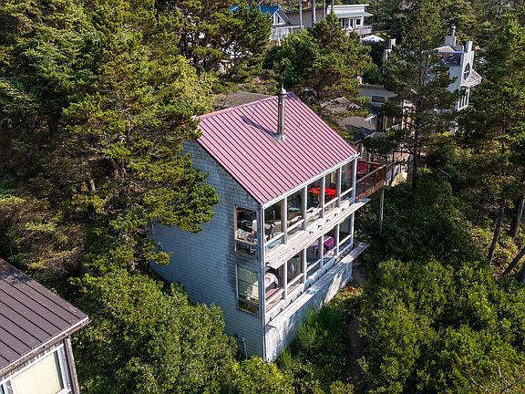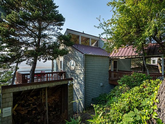 Classic Beachfront Vintage Cabin offers a panoramic view of Netarts Bay and the ocean, complete with beach access! This truly remarkable home on coveted Pearl Street in Netarts was designed and built by a prestigious Portland Architect as his family cabin. Designed for comfortable living and breathtaking scenery, the main floor offers an open-plan layout centered around a retro round fireplace. The entire west wall is lined with floor-to-ceiling windows, ensuring abundant natural light and unobstructed views of the bay. Descending a spiral staircase, are two well-appointed bedrooms. The master bedroom includes an ensuite bathroom and stunning views of the bay.The guest bedroom is located across the hall from a full bathroom with shower/tub combo and a convenient laundry room. Ascending a stairway from the main floor leads to a versatile 3rd-floor loft, perfect for an additional sleeping area, office, or creative space. Outside is a solidly built woodshed with a tile roof, providing practical storage. The current owner holds a transferable Tillamook County Short-Term Rental License, and the property has consistently received almost all 5-star reviews, highlighting its proven popularity and income potential.
