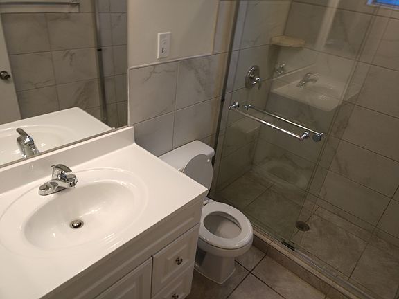 Tiled floorsRemodeled bathroomLarge showerStainless stoveNewer tile