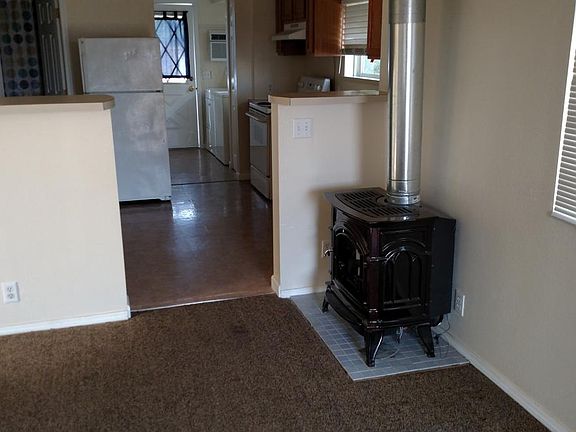 Two bedroom home for rent with fenced yard and 2 car garage , wood burning stove, and washer and dryer. New carpet in Living room. $45 app fee per adult applicant